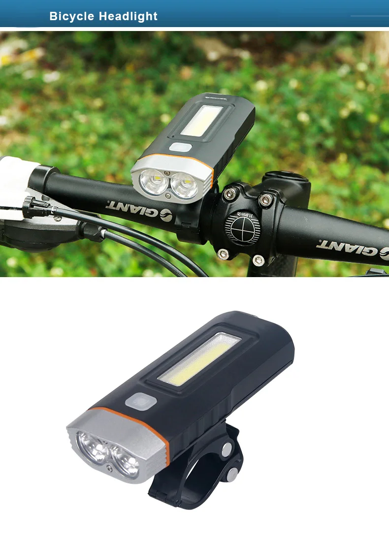 2 диода CREE XM-L 500 люменів + верхній діод COB 200 люмен (функція похідного світильника), 2 змінні акумулятори 18650 по 2000 mAh, заряджання від USB, індикатор заряду.