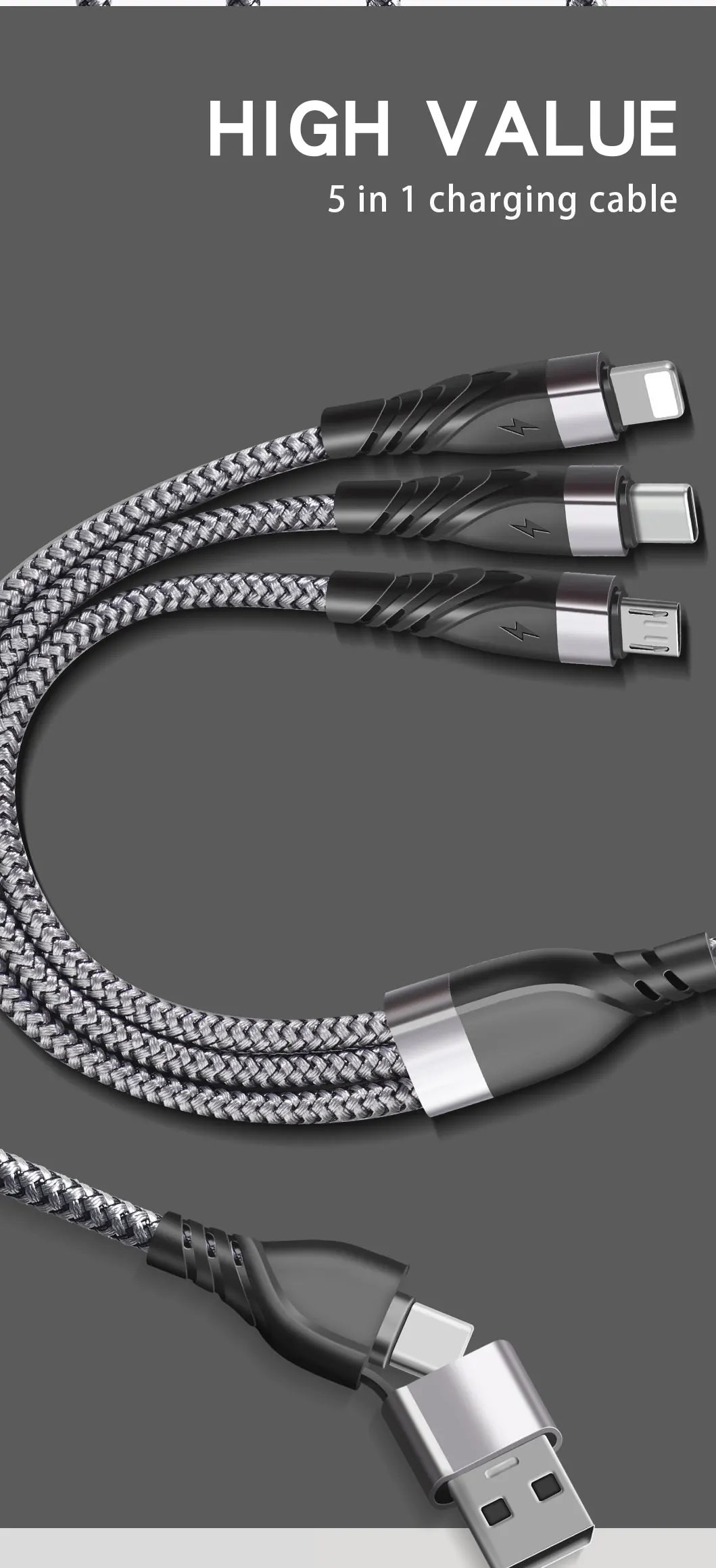 5в1 1.2м. Fast Charger Черный Кабель зарядного устройства Micro USB + IOS + Type-C